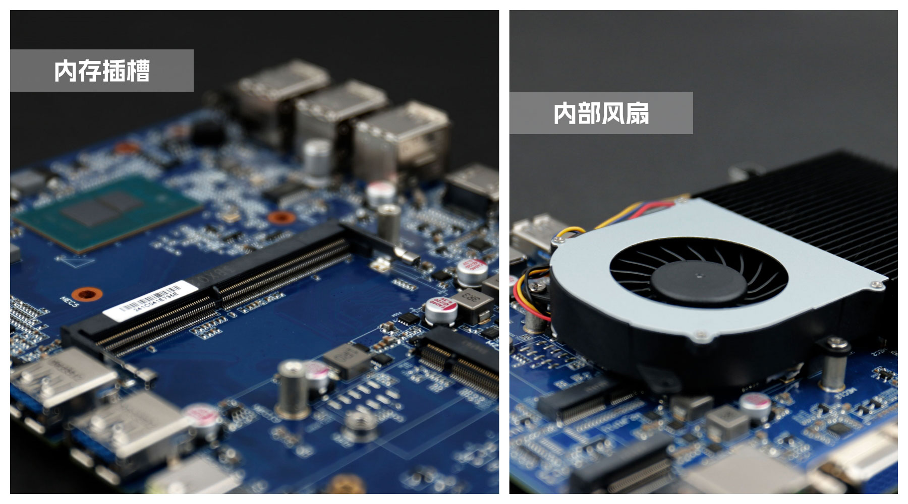 摩根娱乐|数字桌面云终端Y-BOX S2主板中部是内存插槽,采用单通道笔记本内存槽设计,最大支持容量可达32GB,最高支持DDR4-3200MHz频率,横插的形式可以减少主板的占用体积,使整体机身更紧凑,内存顶部的风扇起到高效散热的作用。