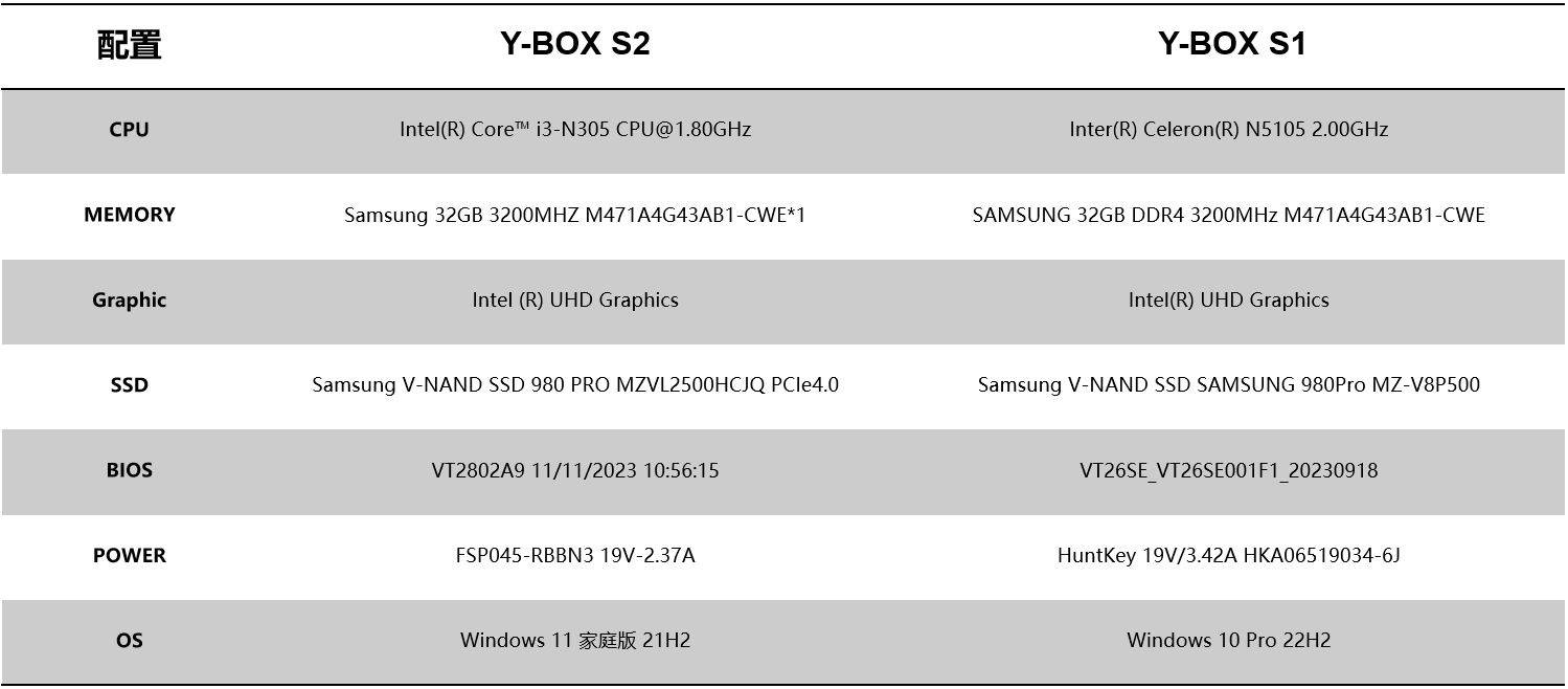 针对桌面云终端Y-BOX S2的测试项目中,最值得关注的是性能测试的跑分数据和稳定性测试内容,这能直观影响主机在使用过程中的稳定性和用户的使用体验。针对性能测试,摩根娱乐选择了将Y-BOX S2与前一款更迭产品Y-BOX S1进行对比分析,Y-BOX S2支持Intel® Alder lake-N处理器,Y-BOX S1支持Intel® Jasper Lake,并分别选取了以下配置: