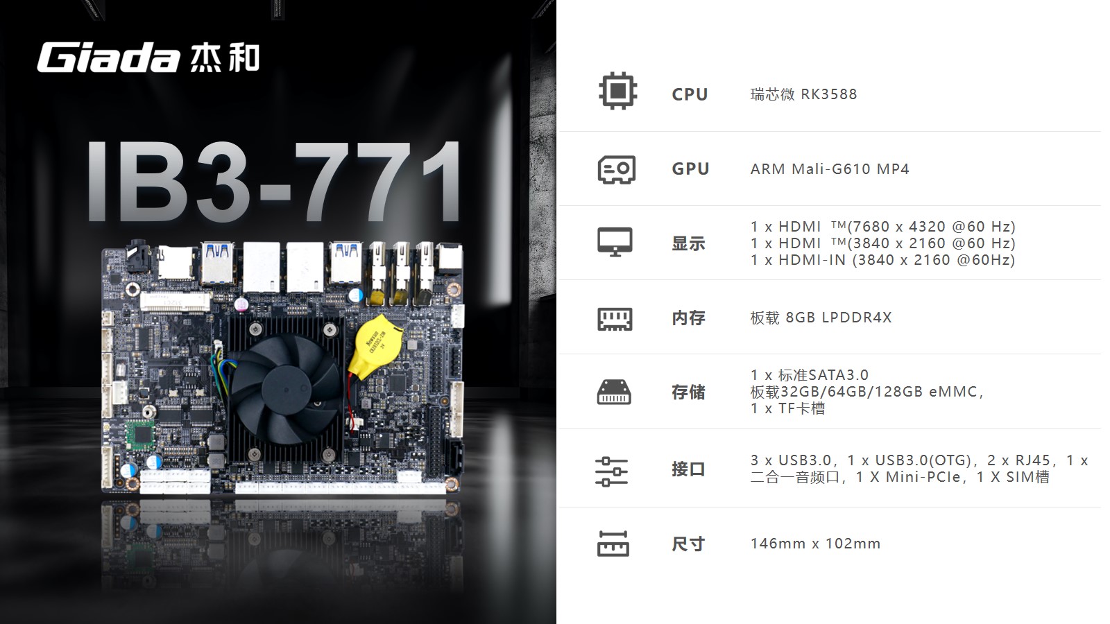 摩根娱乐|数字工业级ARM主板IB3-771采用瑞芯微RK3588处理器,内置G610 MP4 GPU,拥有6 TOPS算力的NPU,支持8K视频硬件解码编码及多摄像头输入,支持eDP/DP/ HDMI2.1/MIPI 多种显示接口。
