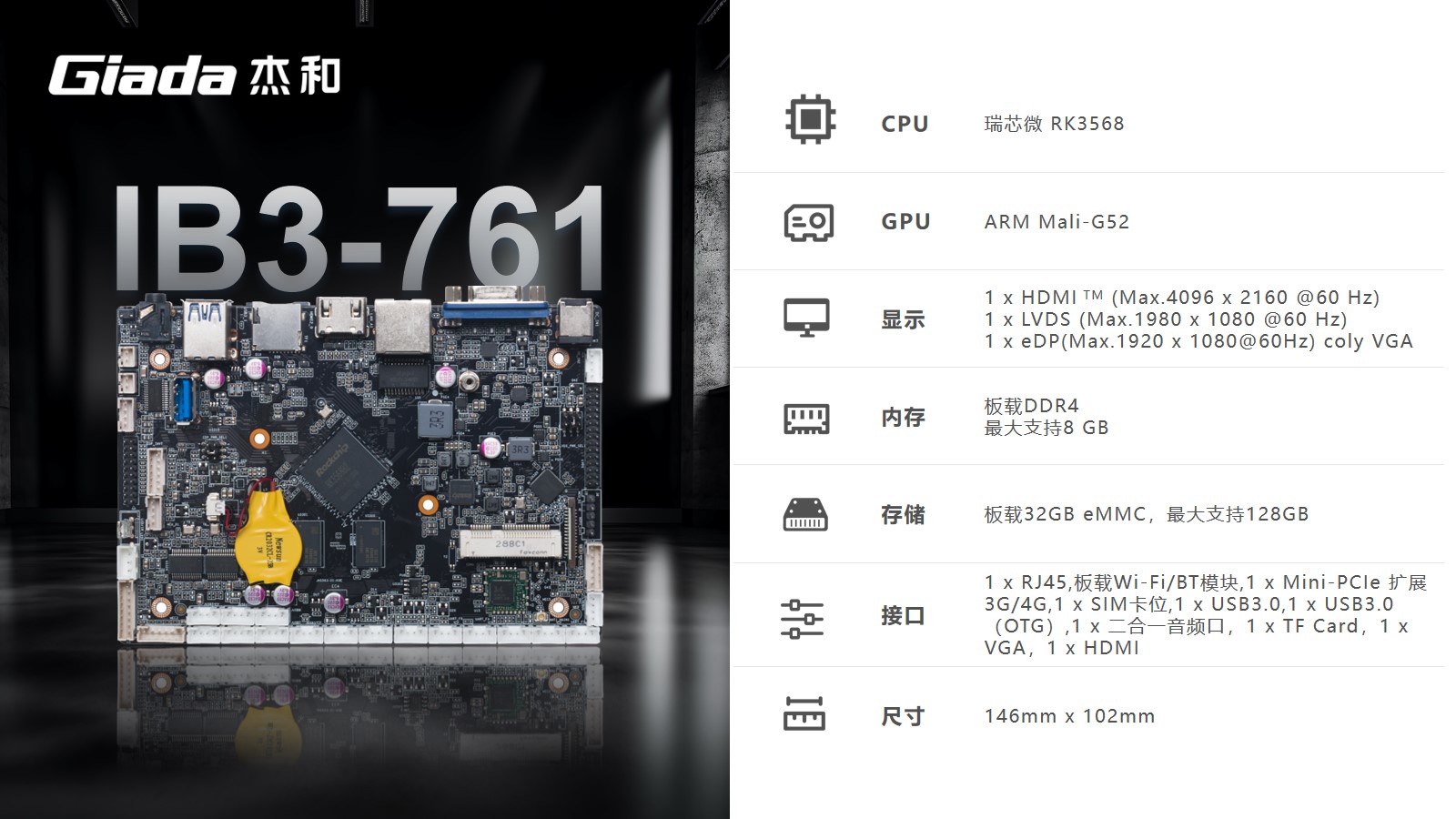 摩根娱乐|数字工业级ARM主板IB3-761基于瑞芯微RK3568四核64位处理器开发。内置1TOPS算力的NPU,满足轻量级端侧AI计算应用。
