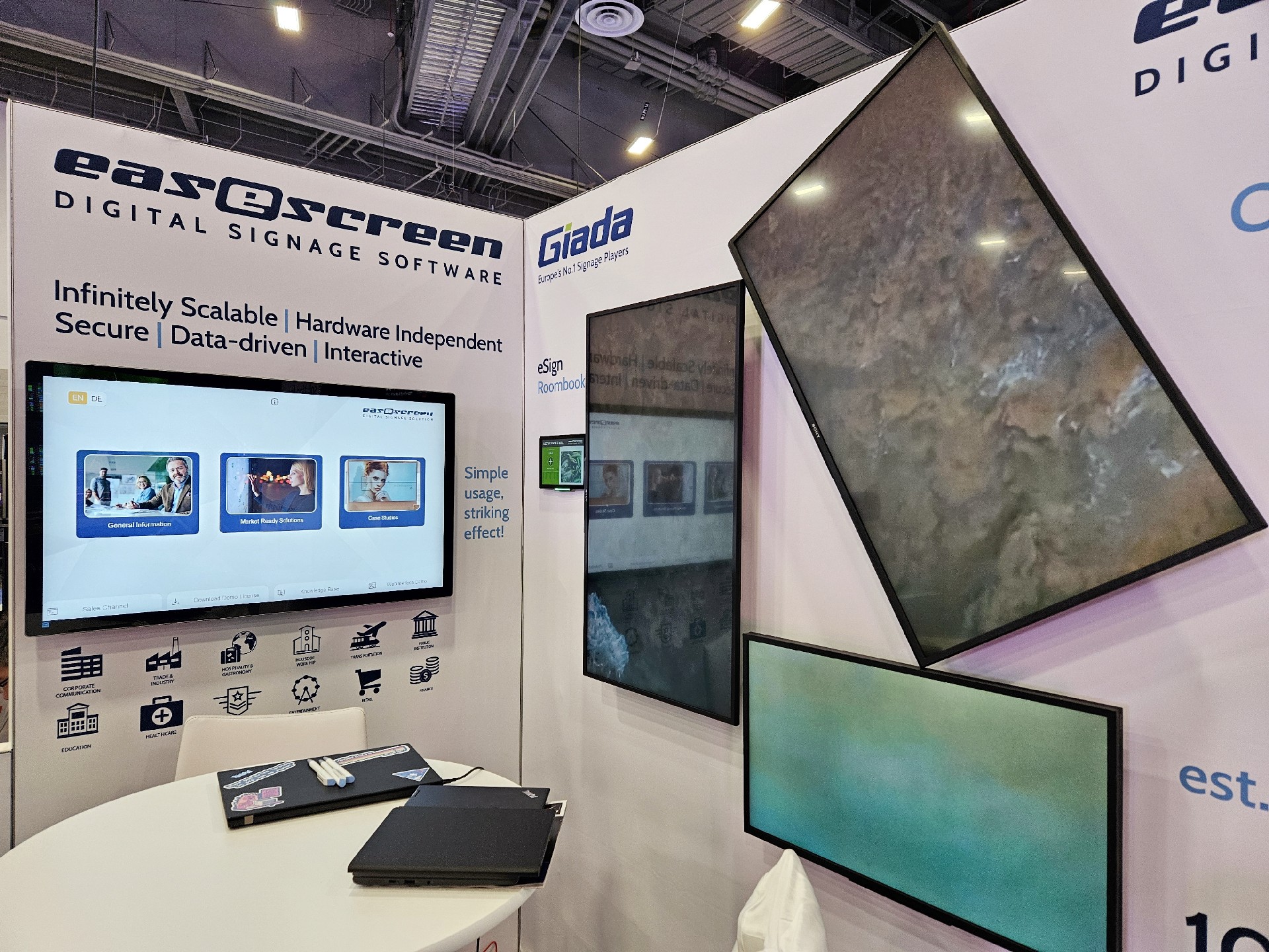 摩根娱乐|数字科技Giada作为全球数字标牌领域的领导品牌,产品应用范围涵盖全球大型连锁店,购物中心,学校,医疗机构,企业办公室等。本次展会,摩根娱乐|数字科技牵手合作伙伴easescreen,展示一系列创新数字标牌解决方案,带来强势产品及最新产品,现场收获超高人气。