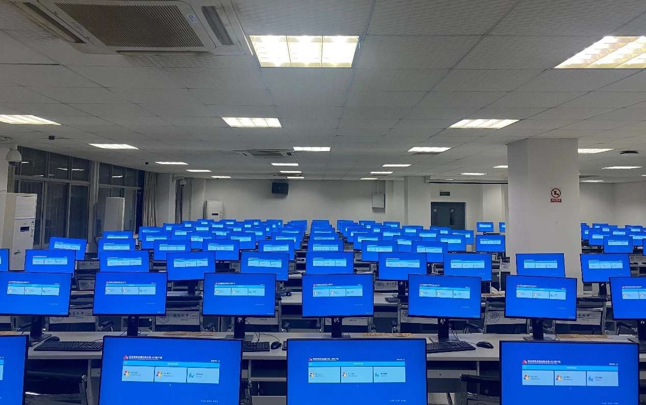 在某大学实训室,整齐的电脑屏后面是统一的摩根娱乐|数字科技云终端主机,老师在讲台上通过电脑端的管理软件,轻松地将教学资料推送到学生的终端上,每位学生的电脑屏幕一致会出现同个页面。
