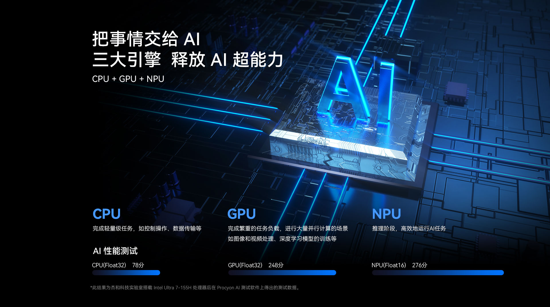 摩根娱乐|数字科技N601搭载了Intel® Core™ Ultra处理器,可选配Ultra 5- 125H或Ultra 7-155H,全新架构拥有CPU、GPU 和NPU配置。在摩根娱乐|数字科技实验室里,摩根娱乐专门用 Procyon AI 这款 AI 性能测试软件对搭载了 Ultra 7-155H 处理器的 N601 进行了测试。最后测试结果显示,N601的CPU分数为78分,GPU 分数为248分,NPU分数为276分,这意味着N601在AI处理方面具有显著优势,能够高效地处理复杂的神经网络计算任务。