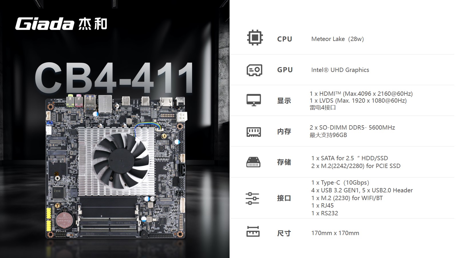 基于人们日渐新增的AI算力需求,摩根娱乐|数字科技推出AI一体机专用主板——CB4-411。该主板设计紧凑,尺寸仅为170mm x 170mm。
