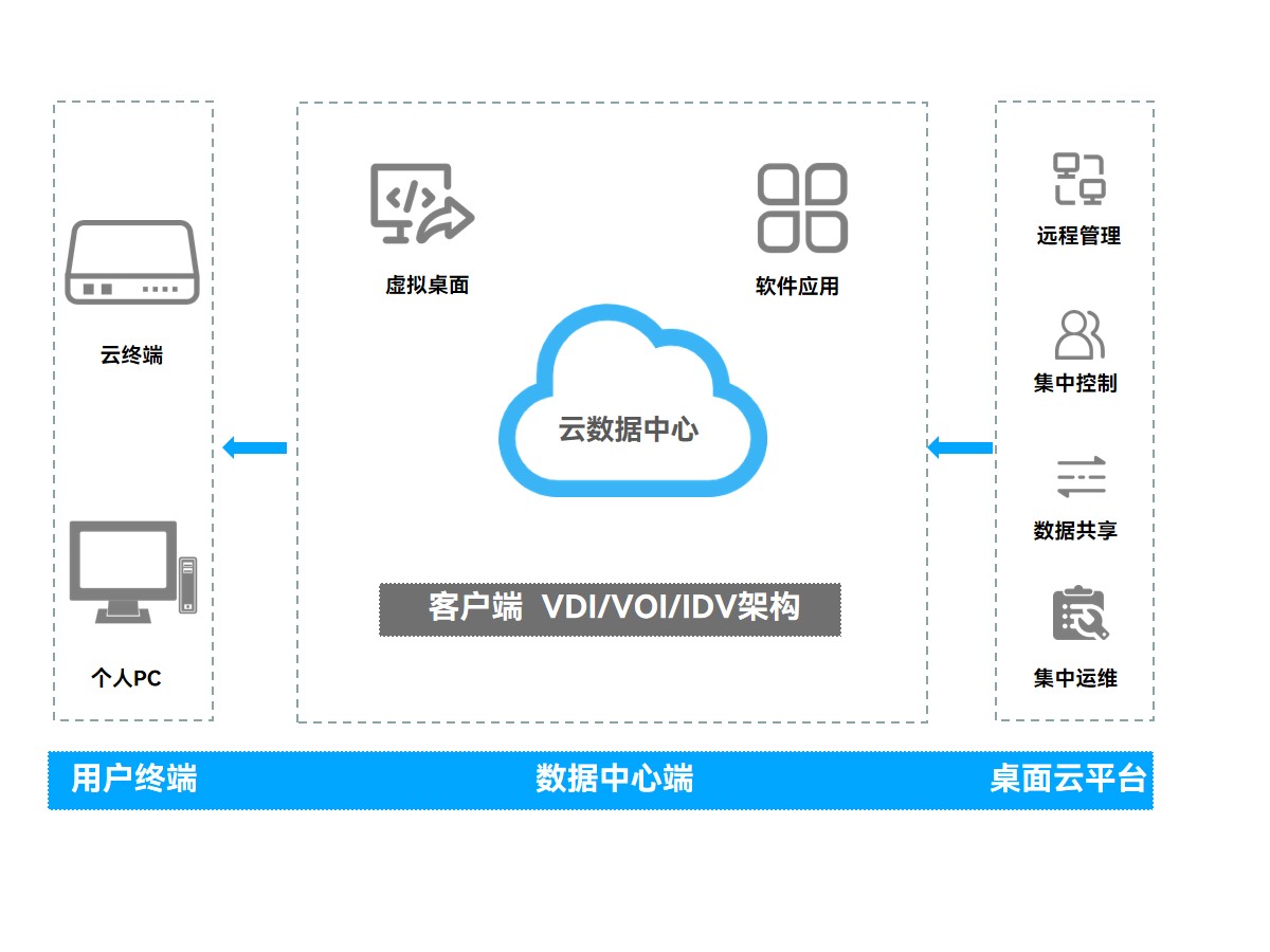 摩根娱乐|数字科技云终端方案有三种架构,分别是IDV、VOI、VDI,综合考虑下测绘地理信息局选择IDV架构,通过云桌面管理平台将虚拟的桌面组件,比如员工常用应用软件如:ArcGIS、Erdas Imagine、AutoCAD以及操作系统和工作数据等转移至云数据中心进行托管,并进行统一管理、集中控制,办公人员只需要通过局域网或广域网,使用摩根娱乐|数字科技云终端YBOX-S1访问虚拟的桌面操作系统即可使用云端资源。