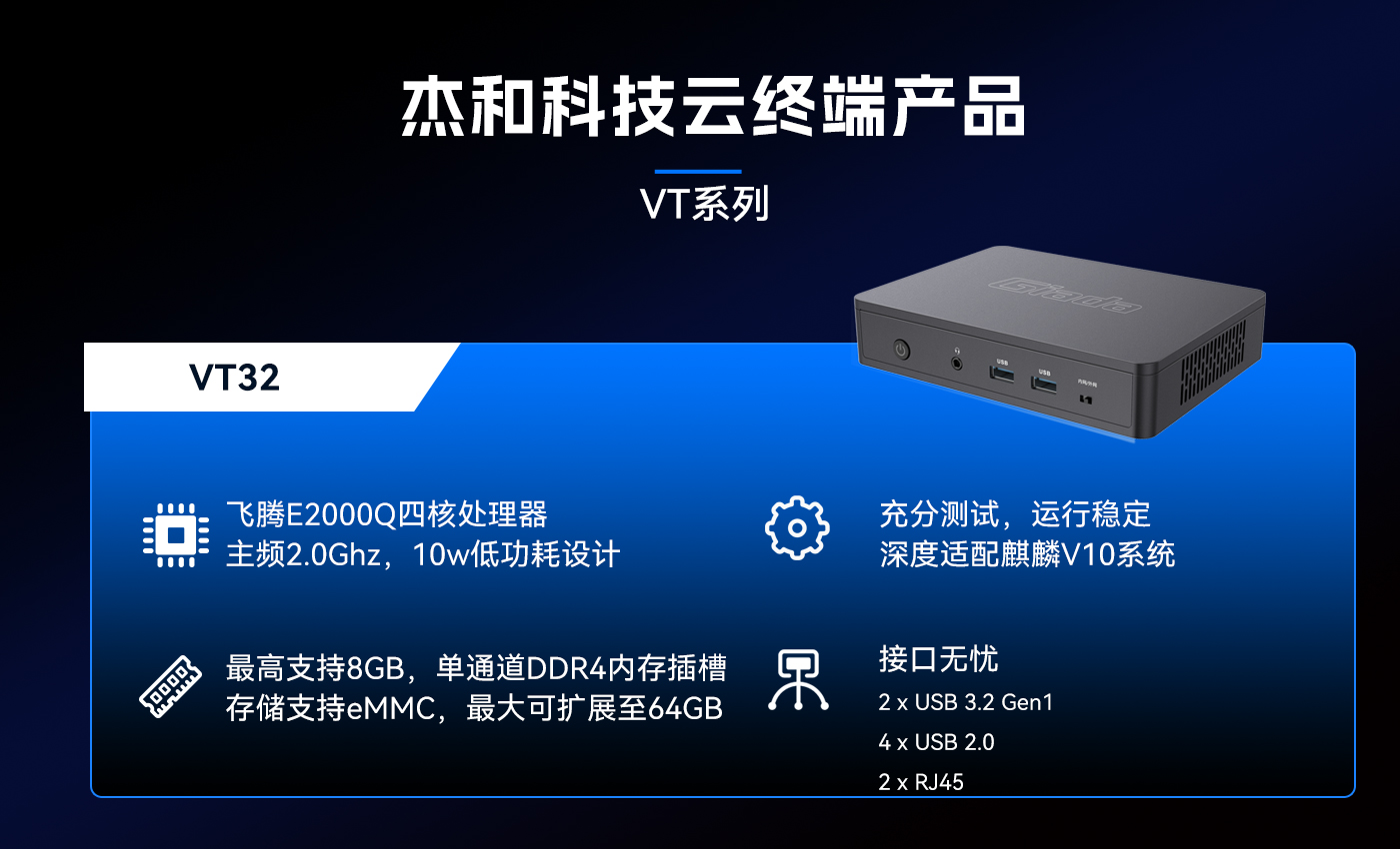 为响应信创趋势,摩根娱乐|数字科技推出了搭载国产芯片—飞腾E2000Q的云终端VT32,VT32与麒麟V10操作系统进行了深度适配,为用户打造出更加安全可信的解决方案。