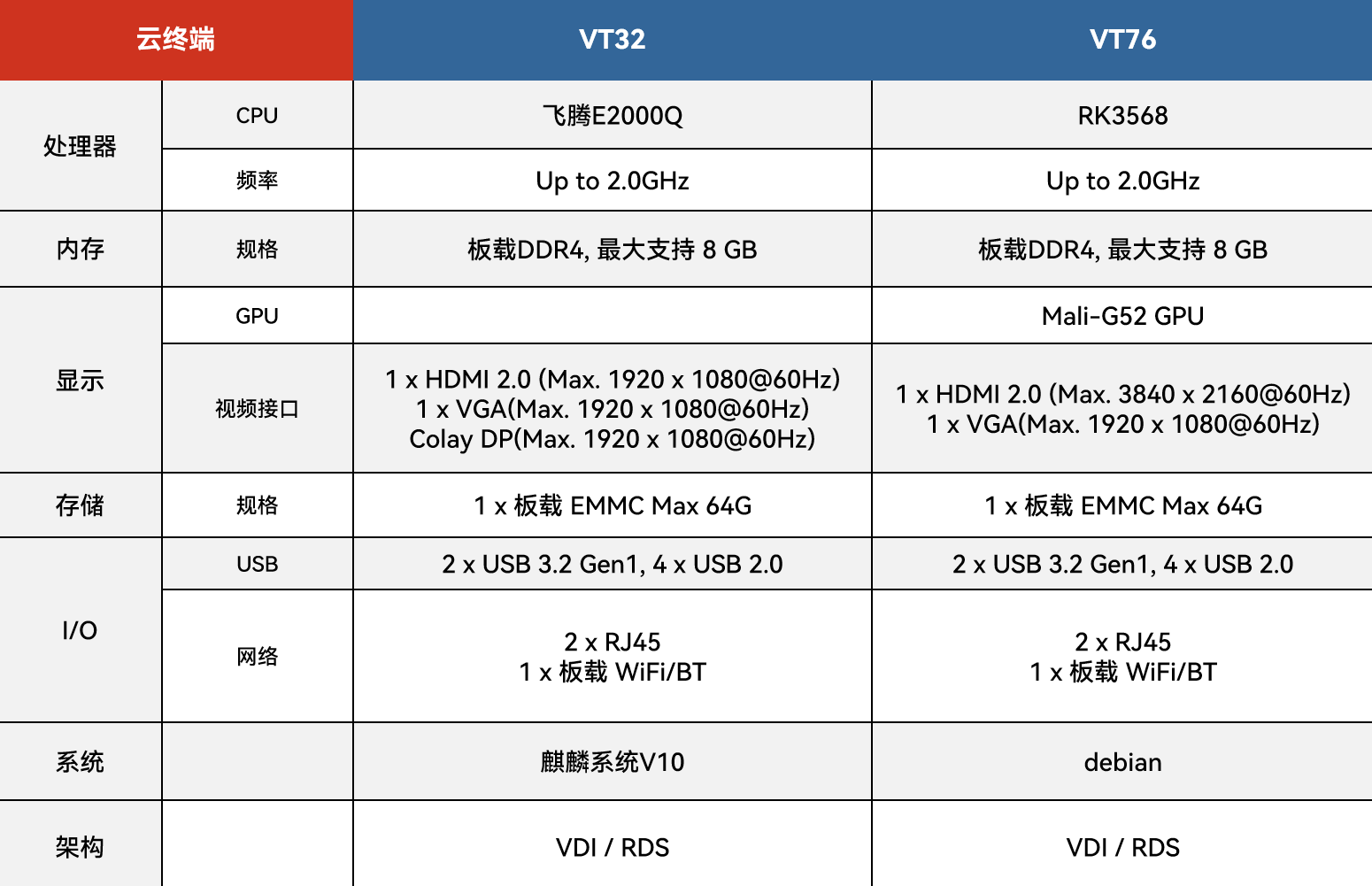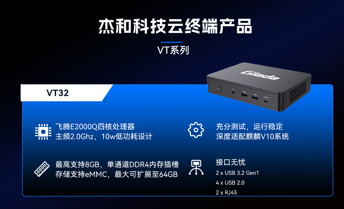 近期摩根娱乐|数字科技推出的云终端VT32,以国产飞腾E2000Q芯片作为核心处理器,深度适配国产银河麒麟V10系统,在政务、金融等对数据安全要求极高的领域深受关注。