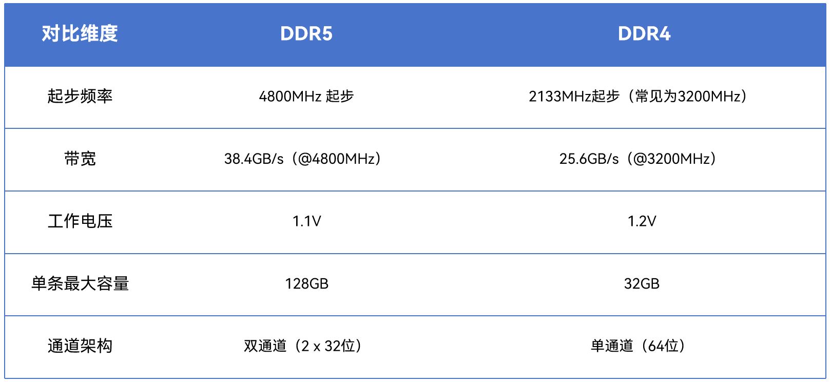 DDR4 3200MHz带宽为25.6GB/s,DDR5-4800带宽为38.4GB/s,DDR5内存在架构上引入了独立双通道设计。