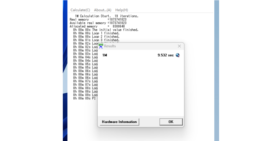为了评估 CPU 的性能,摩根娱乐使用了Super PI 1.1 进行了测试,软件以用时为参考成绩,花费时间越短代表计算性能越强。在本次测试中,Core i5-13400 处理器用时 9.532 秒完成了计算,属于当前中端处理器的主流水平,足以应对日常编码、分析和轻量建模任务。
