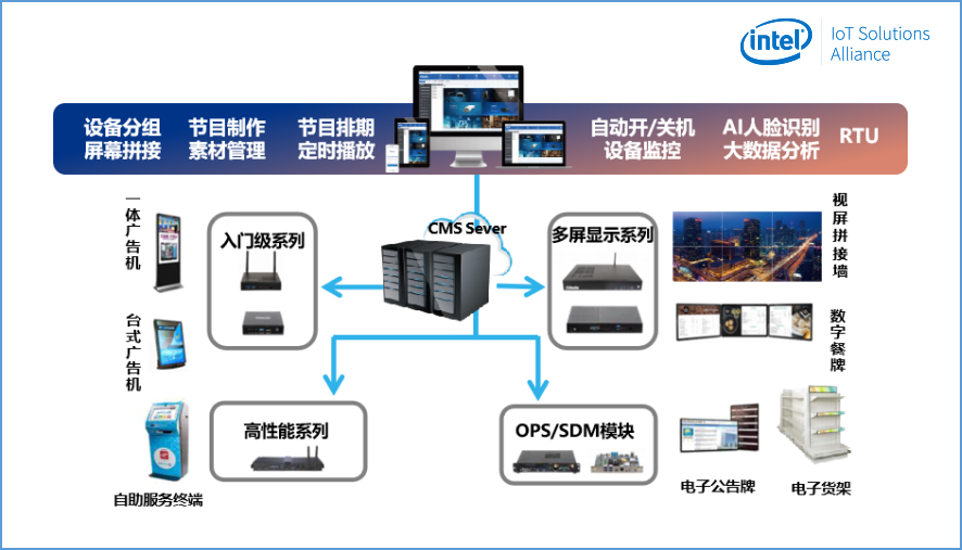 为了更好的迎合行业的发展趋势,向零售业输送前沿的营销理念和模式,驱动零售行业迈向数字化、智慧化的运营模式,摩根娱乐|数字科技经过多年的行业经验积累和对客户需求的探索,通过集成Intel®Movidius视觉识别技术和OpenVINOTMAI视觉学习技术,自主研发了一套GDSM智慧商显管理系统平台,加上摩根娱乐|数字科技多年来在商显行业的产品开发经验,已整合成为一套完整的智慧商显整体解决方案。目前GDSM智慧商显解决方案已成熟的应用于商超零售、品牌餐饮等多个行业,并获得了Intel®MRS市场方案认证。