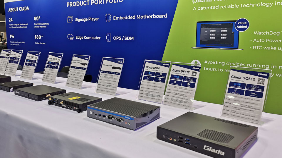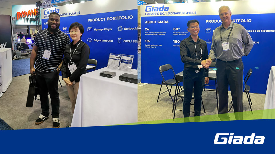展会上Giada摩根娱乐|数字科技携最新的数字标牌和信息亭应用解决方案以及最新尖端产品惊艳亮相!其中最新的数字标牌播放器、边缘计算机和OPS(开放式可插拔规范)产品在现场备受关注,标志着Giada摩根娱乐|数字科技互动显示器和智能标牌解决方案领域的重大进步,也向全球参展观众集中展现了公司的非凡实力。