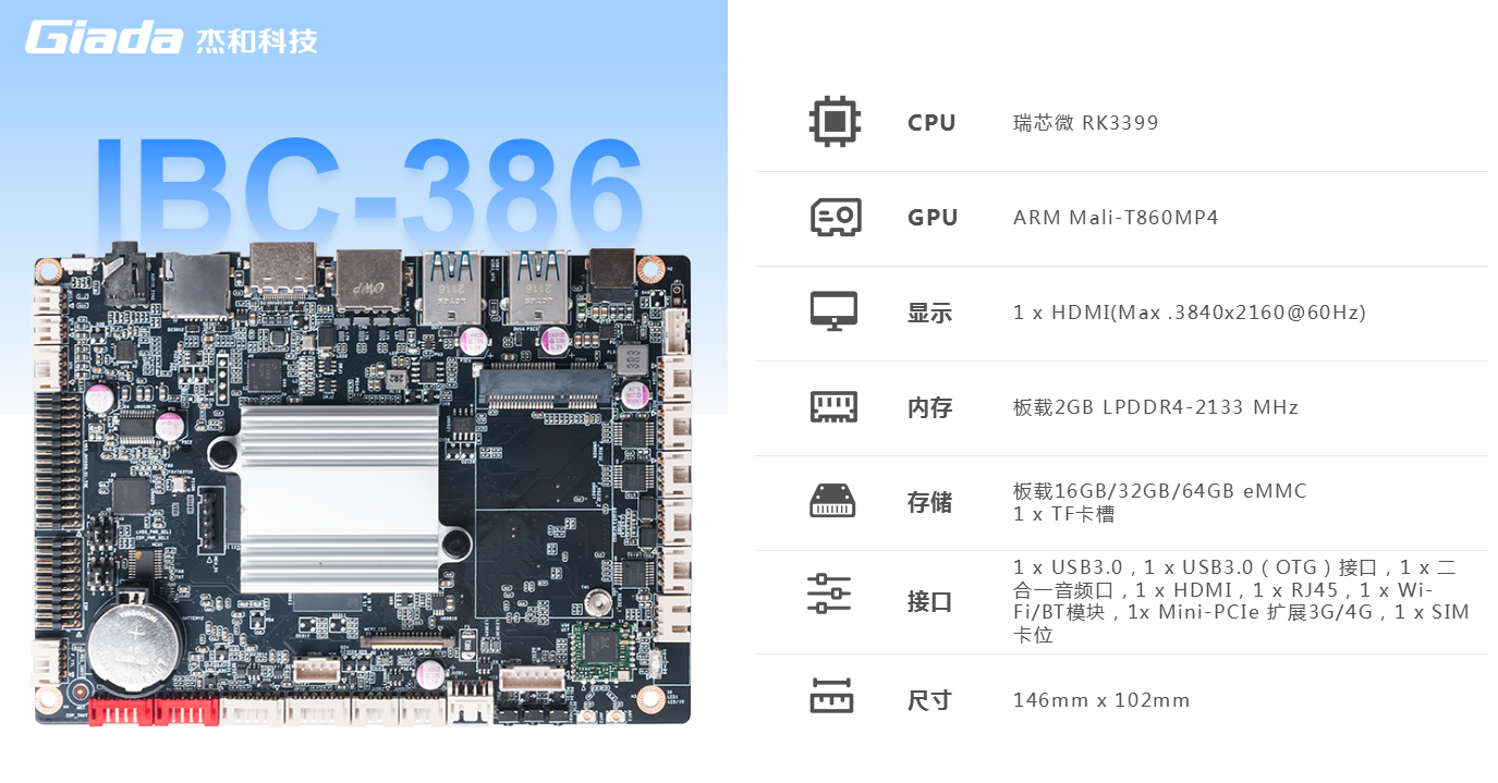 摩根娱乐|数字科技IBC-386是一款基于ARM架构的3.5英寸主板,采用瑞芯微RK3399处理器(双Cortex-A72大核+四 Cortex-A53小核)六核 64 位CPU。RK3399作为瑞芯微超级扩展全能型旗舰级芯片,GPU采用四核ARM新一代高端图像处理器Mali-T860MP4,具备高性能、低功耗、强大的视觉处理能力的特点。IBC-386板载2GB LPDDR4-2133 MHz内存,板载16GB/32GB/64GB eMMC,支持1x TF卡槽,多种形式轻松扩展存储容量。