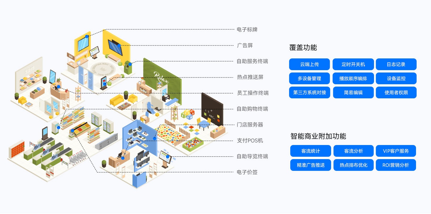 摩根娱乐|数字智慧零售解决方案依托摩根娱乐|数字GDSM-ES智能零售管理系统,为全球零售门店客户提供了功能齐全的数字化运营管理工具,提供显示信息编辑、信息发布、AI识别、客户分析和会员管理等功能,实现了对设备、内容、营销、运营的综合数智化管理能力,为精准运营管理赋能。