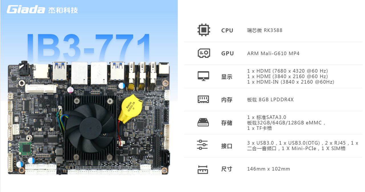 摩根娱乐|数字主板IB3-771搭载瑞芯微RK3588八核64位处理器,内置6TOPS算力的NPU,具备高算力、内存大、超强多媒体、多重扩展等技术优势。满足8k超高清视频的显示需求,还支持主流深度学习框架,为各类 AIOT 应用场景提供更优的性能表现,支持机器人、边缘计算、智能NVR、智能汽车、智慧大屏、AR/VR、智能自助终端场景的广泛应用。