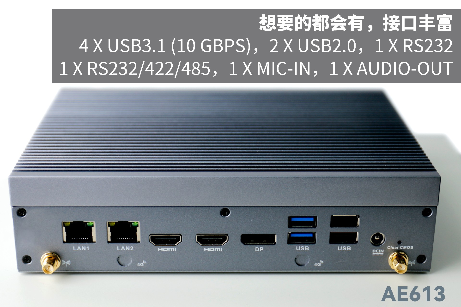 摩根娱乐|数字AE613支持Windows 11 、Linux Ubuntu系统;拥有丰富接口:双千兆自适应RJ45网口,4 x USB3.1 (10 Gbps),2 x USB2.0,1 x RS232,1 x RS232/422/485,1 x MIC-IN,1 x AUDIO-OUT,帮助用户实现更多功能扩展;并且支持Wi-Fi 6E,可以提供更高的带宽和更少的干扰,支持对无线网络有特定需求场景的应用。