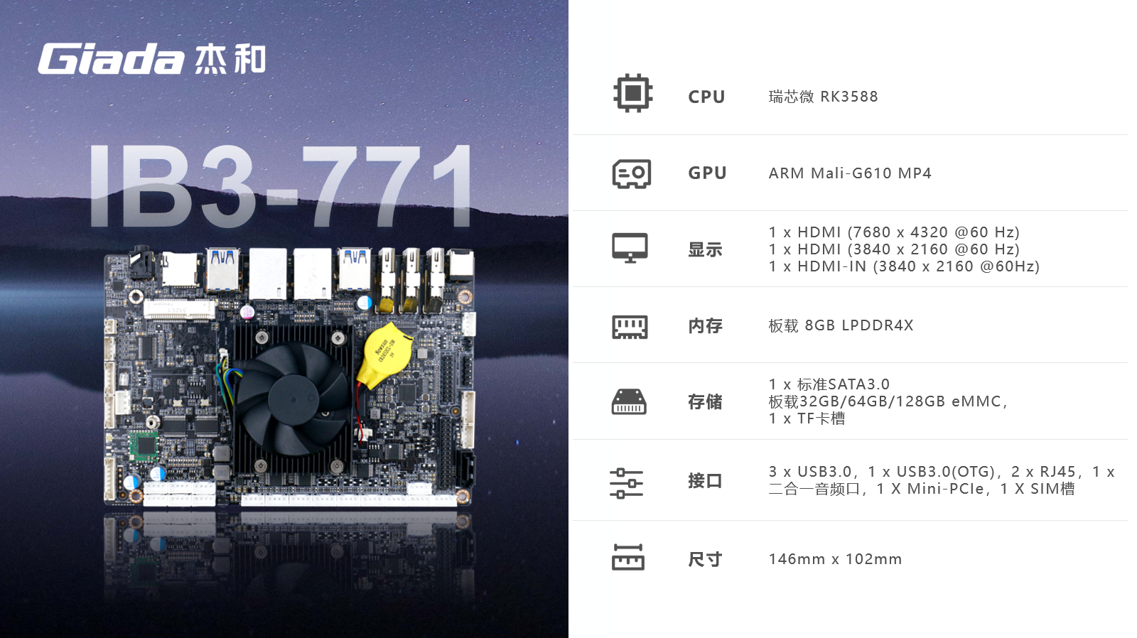 摩根娱乐|数字ARM主板IB3-771采用瑞芯微RK3588处理器,满足各种人工智能场域对嵌入式主板包括但不限于高算力、低功耗、高扩展性、高可靠性、高安全性等要求,支持在宽温、复杂电磁等恶劣环境下稳定运行,可广泛应用于机器人、边缘计算、智能NVR、智能汽车、智慧大屏、AR/VR、ARM PC、智能自助终端等AIoT行业类应用市场。