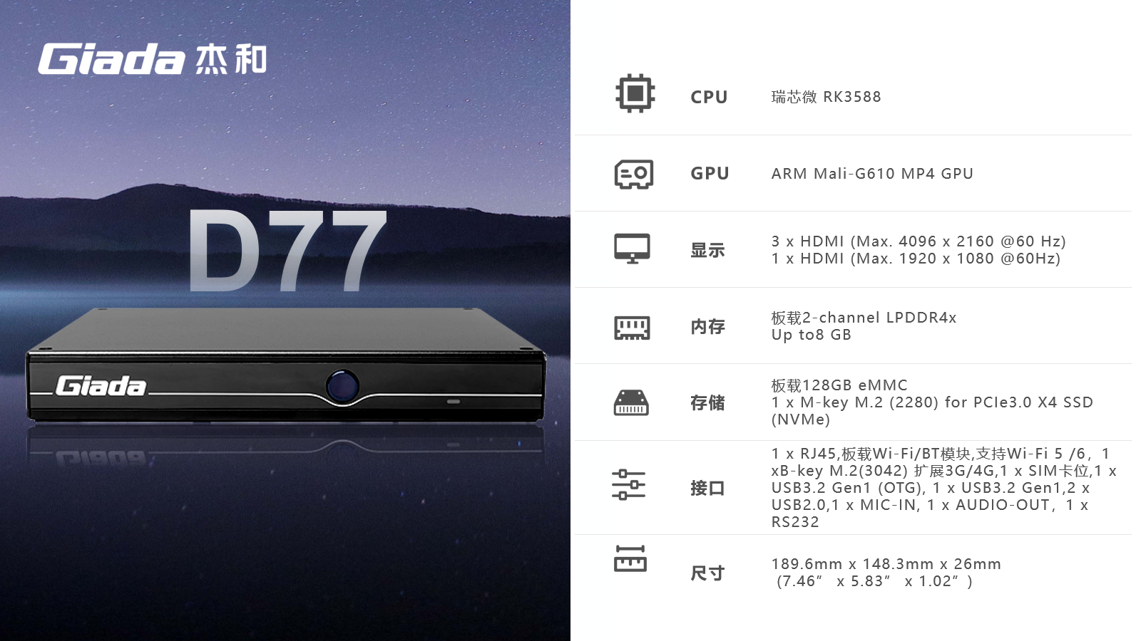 AIoT的落地场景包括智慧工业、智慧零售、智慧社区、智慧城市、智能显示、医疗健康等领域,在实际落地时,对物联网硬件设备的AI算力、数据运算、存储能力,稳定性及可扩展性能等提出更高要求,Giada摩根娱乐|数字科技作为行业领先的物联网数智化技术服务商,深入布局AIoT领域,推出AI产品系列,包括3.5寸主板、嵌入式整机、边缘计算盒子等,全方位覆盖了入门级到高性能级,满足不同应用场景的需求,为用户赋能。