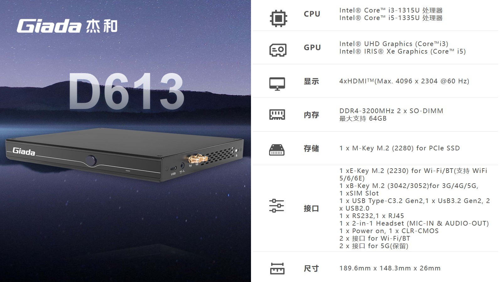 摩根娱乐|数字科技D613可选配Intel®第13代AlderLake i5-1335处理器,作为家用迷你主机来说,足够大的内存容量也可以提升迷你主机的性能表现,更好地支持多任务处理,大型应用程序的运行以及高清视频编辑等任务,拥有的2个SO-DIMM插槽,内存DDR4最大支持64GB的内存容量可以减少系统对硬盘的依赖,提高系统的响应速度。